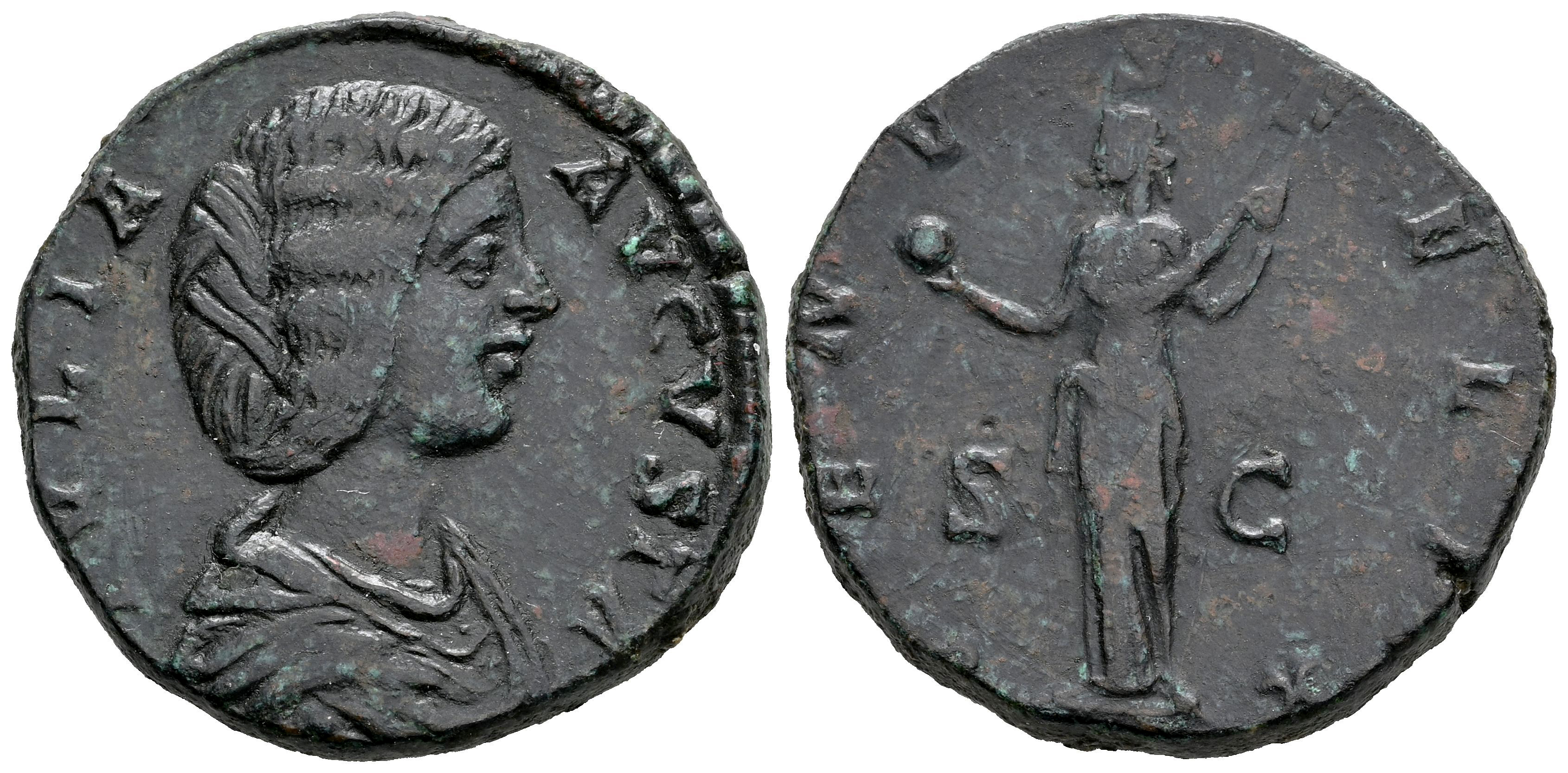 Julia Domna. Sestercio. 207-211 d.C. Roma. (Ric-IV 866). (Bmcre-775). (Banti-47). Anv.: IVLIA AVGVSTA. Busto drapeado a la derecha. Rev.: VENVS FELIX. Venus en pie de frente, mirando hacia la izquierda, manzana hacia arriba en la mano derecha, levantando los pliegues del drapeado con la izquierda. Ae. 19,76 g. Ex Meister & Sonntag 9 (26/05/2010), lote 222. Conserva la etiqueta original. MBC+. Est...300,00.