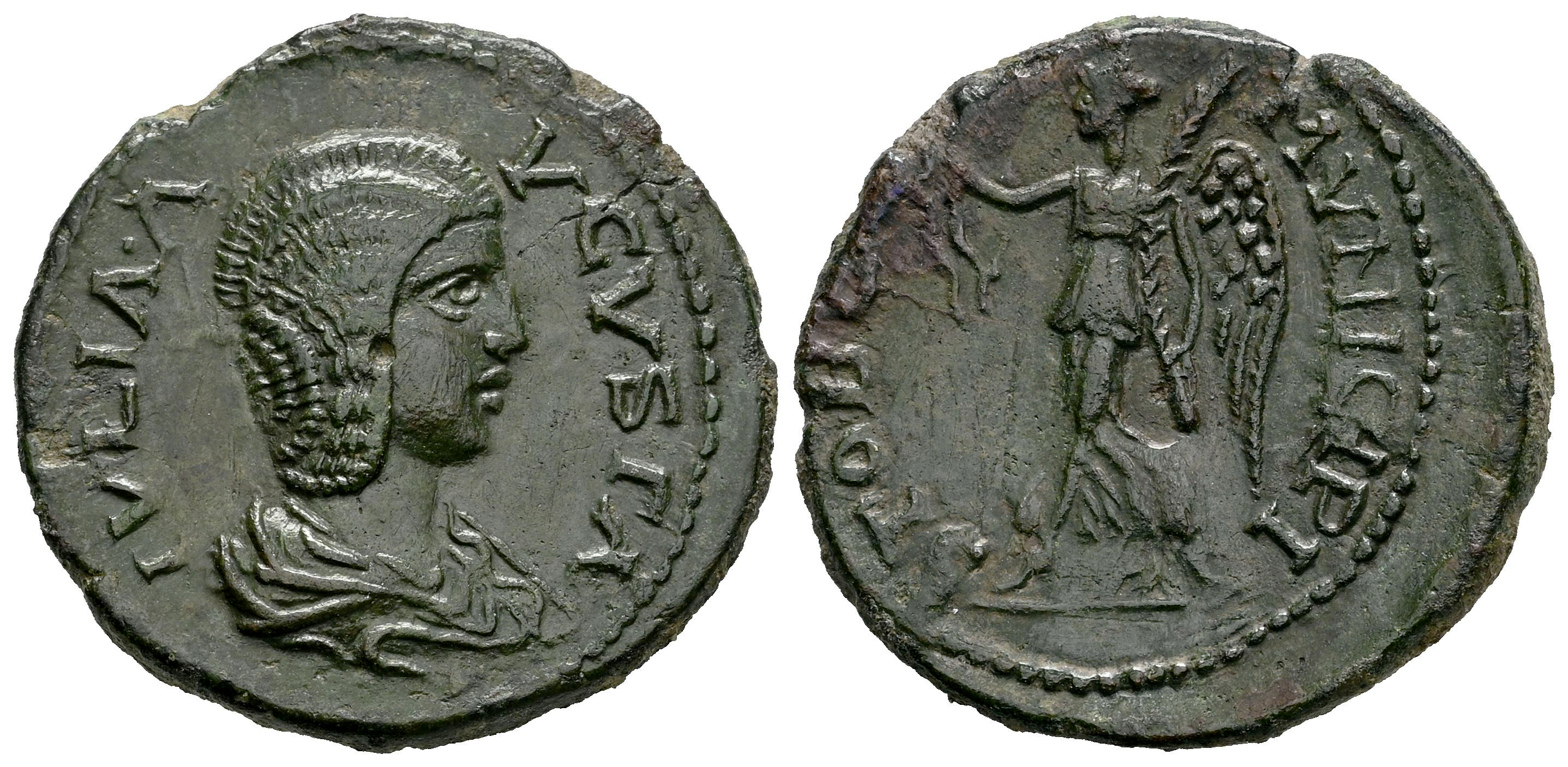 Julia Domna. AE 24. 193-217 d.C. Stobi. Macedonia. (Varbanov-3923). (Kuzmanovic-283). (cf. Josifovski-154/96). Anv.: IVLIA AVGVSTA. Busto drapeado a la derecha. Rev.: STOBEN MVNICIPI. Victoria avanzando hacia la izquierda, sosteniendo corona y palma. Ae. 6,79 g. Bonita pátina verde. Buen ejemplar para este tipo. EBC-/MBC+. Est...100,00.