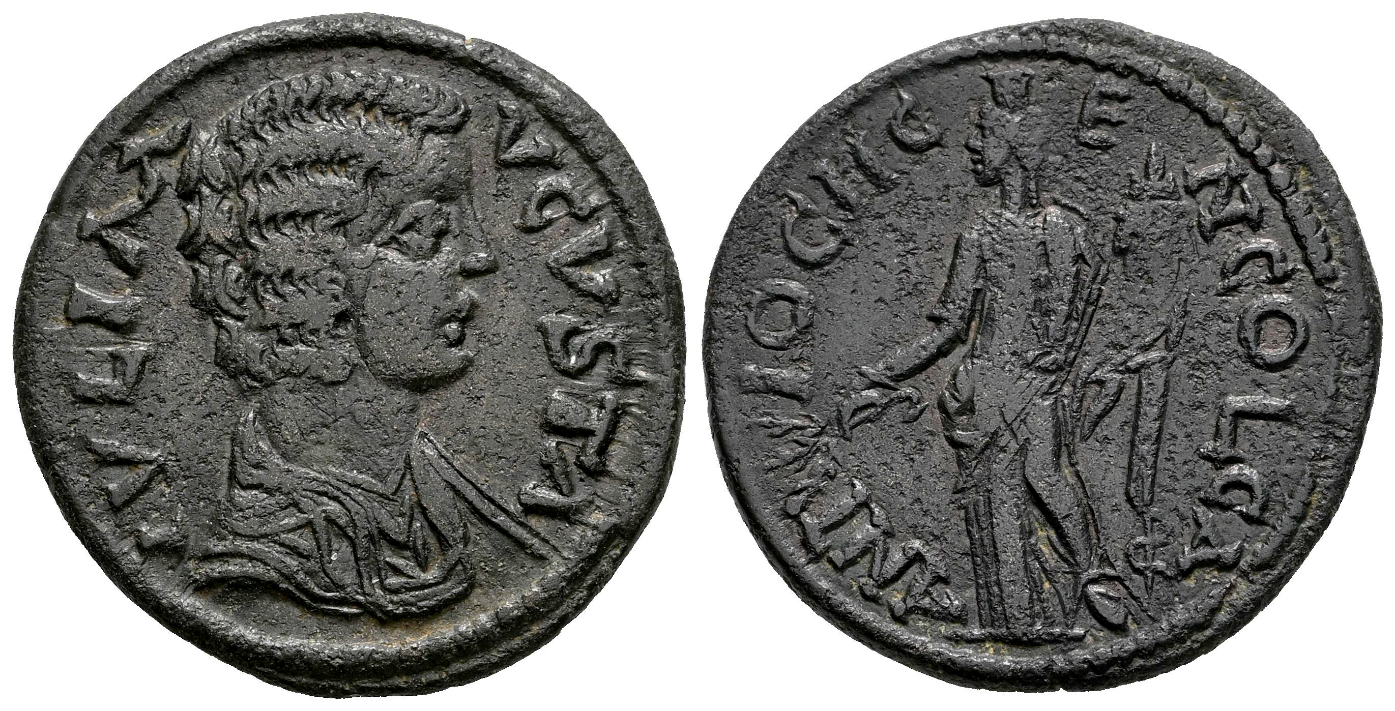 Julia Domna. AE 23. 193-211 d.C. Antioquía. Pisidia. (SNG BnF-1128/31). Anv.: IVLIA AVGVSTA. Busto drapeado a la derecha. Rev.: ANTIOCH GEN COL CA. Genio en pie a la izquierda, sosteniendo cornucopias y rama. Ae. 5,97 g. Ex Ancient Coins Canada, Vcoins (2010). MBC/MBC-. Est...50,00.