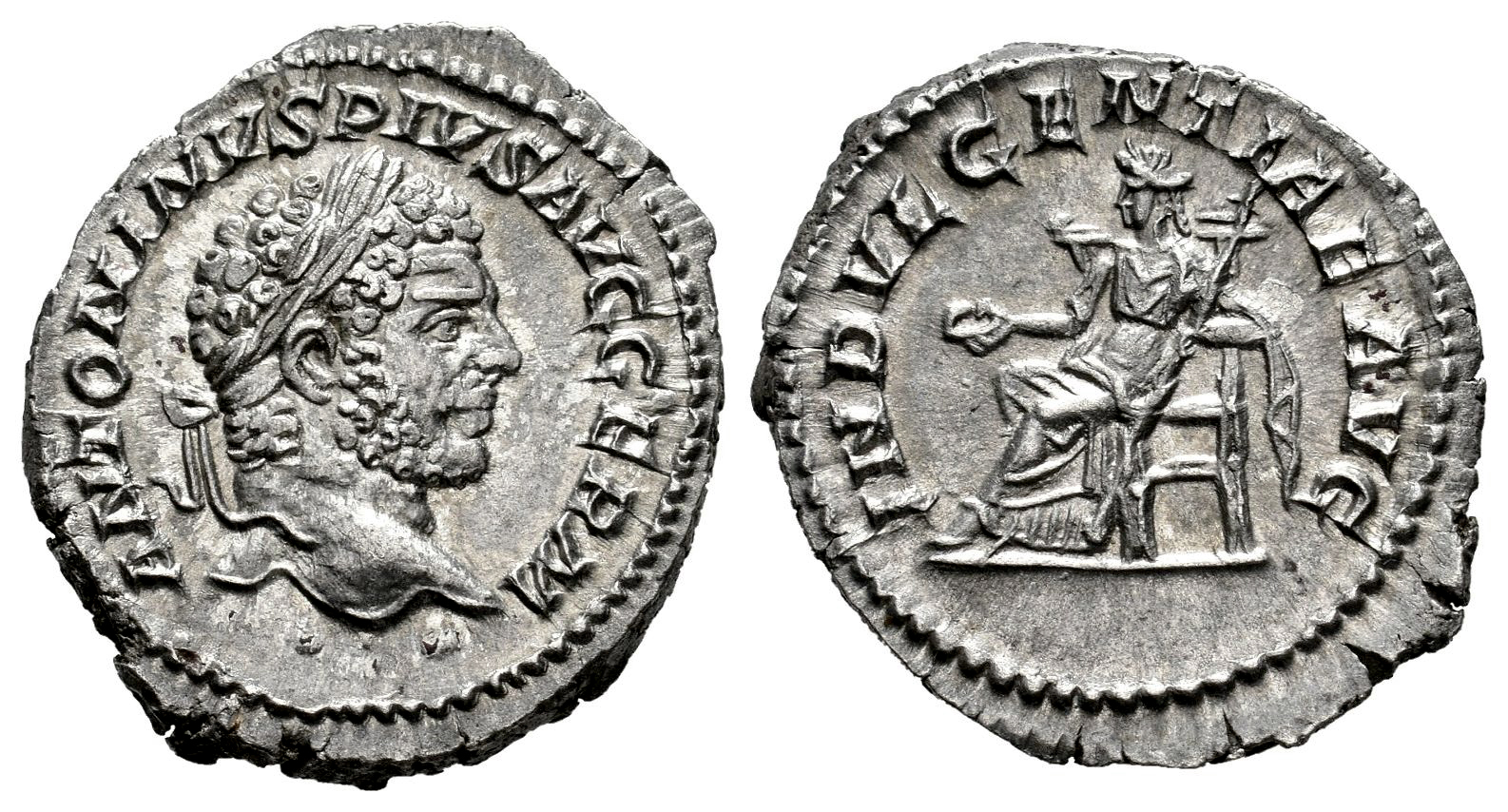 Caracalla. Denario. 197-217 d.C. Roma. (Ric-IV 300). (Rsc-103). (68). Anv.: ANTONINVS PIVS AVG GERM. Cabeza laureada a la derecha. Rev.: INDVLGENTIAE AVG. Indulgentia sedente a la izquierda, sosteniendo pátera y cetro. Ag. 3,17 g. EBC+. Est...140,00.
