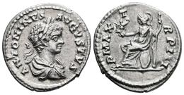 Caracalla. Denario. 200 d.C. Laodicea. (Ric-342b). (Bmcre-716). (C-181). Anv.: ANTONINVS AVGVSTVS. Busto laureado, drapeado y con coraza a la derecha. Rev.: P MAX TR P III. Roma sedente a la izquierda sobre un escudo, sosteniendo una Victoria en su mano derecha y una lanza en la izquierda. Ag. 3,10 g. Ex Soler&Llach (04/2009), lote 2232. MBC+. Est...100,00.
