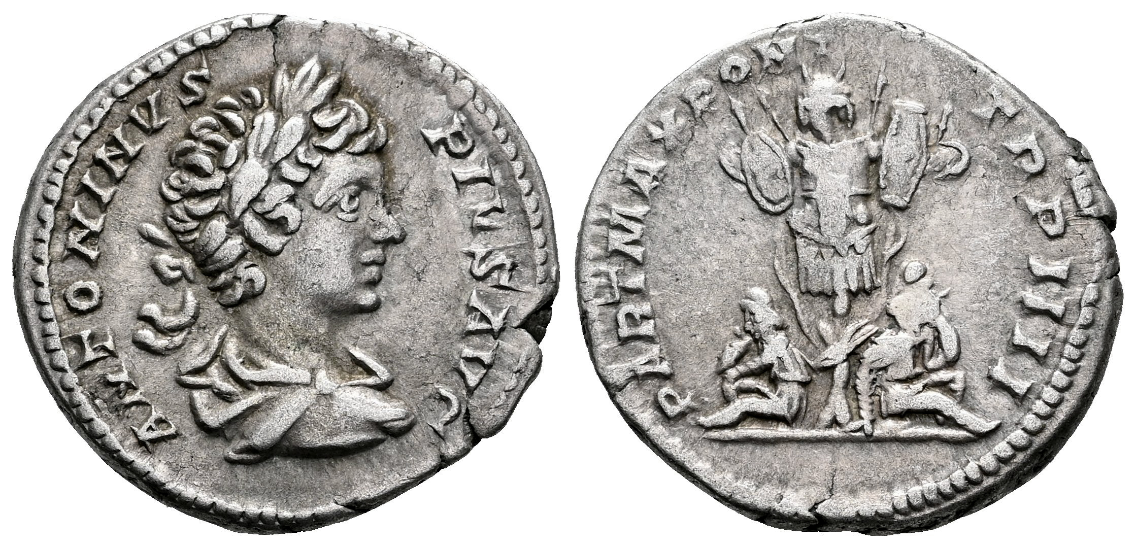 Caracalla. Denario. 201 d.C. Roma. (Ric-IV 54b). (Bmcre-262). (Rsc-175 corr.). Anv.: ANTONINVS PIVS AVG. Busto laureado y drapeado a la derecha. Rev.: PART MAX PONT TR P IIII. Trofeo de armas, con dos cautivos sentados a izquierda y derecha en la base. Ag. 3,35 g. MBC+. Est...100,00.