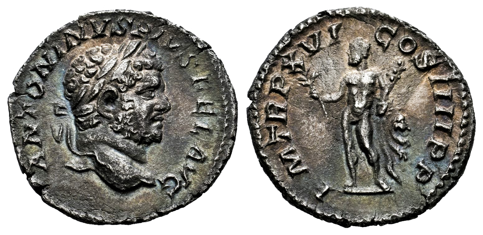 Caracalla. Denario. 213 d.C. Roma. (Ric-IV 260b). (Bmcre-p.440). (Rsc-221). Anv.: ANTONINVS PIVS FEL AVG. Cabeza laureada a la derecha. Rev.: P M TR P XVI COS IIII P P. Hércules con piel de león sobre el brazo, en pie a la izquierda, sosteniendo una rama y una maza. Ag. 2,61 g. Bonita pátina de monetario con tonos iridiscentes. MBC+/EBC-. Est...120,00.