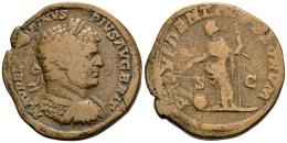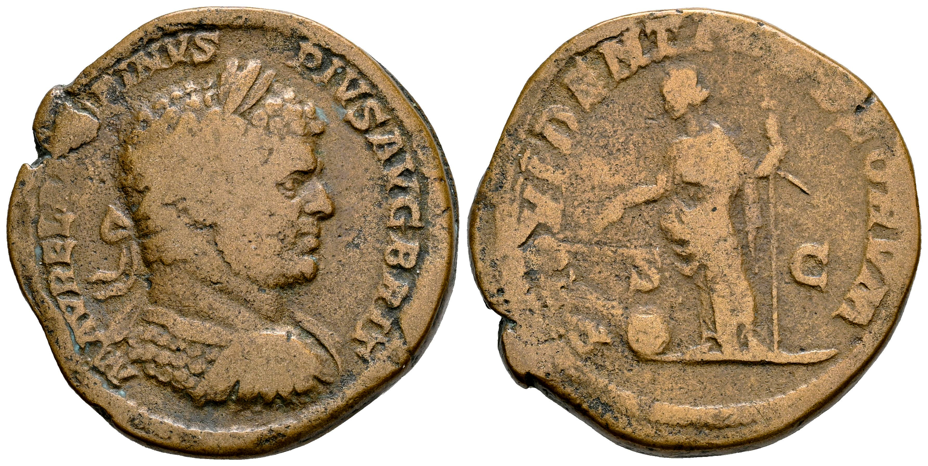 Caracalla. Sestercio. 214-217 d.C. Roma. (Ric-511d). (Bmcre-410, 247). Anv.: M AVREL ANTONINVS PIVS AVG BRIT. Busto laureado y con coraza a la derecha. Rev.: PROVIDENTIAE DEORVM. Providentia en pie a la izquierda, sosteniendo una vara sobre un globo y un cetro; S-C en los campos inferiores. Ae. 18,15 g. Escasa. BC+/BC. Est...120,00.