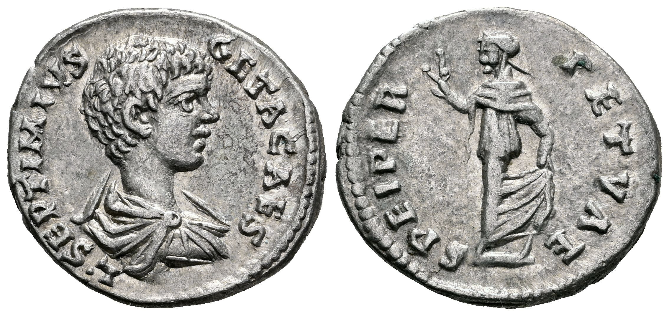 Geta. Denario. 198-200 d.C. Laodicea. (Ric-96). (Bmcre-688). (Rsc-192a). Anv.: L SEPTIMIVS GETA CAES. Busto a la derecha con la cabeza desnuda, drapeado y coraza. Rev.: SPEI PERPETVAE. Spes avanzando hacia la izquierda, sosteniendo una flor y levantando las dobleces de sus ropajes. Ag. 3,27 g. Leves restos de brillo original. Ex Classical Numismatic Group 226 (27/01/2010), lote 539. EBC-. Est...150,00.