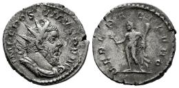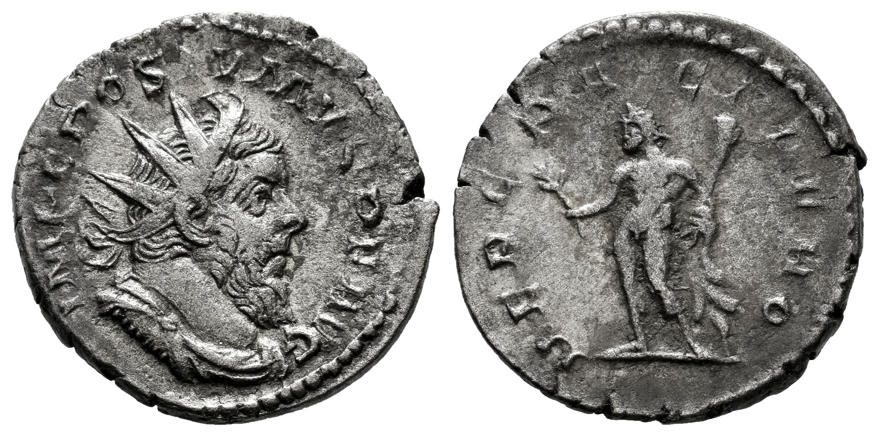 Póstumo. Antoniniano. 262-263 d.C. Treveri. (Ric-V 2.67). (Rsc-101a). Anv.: IMP C POSTVMVS P F AVG. Busto radiado, drapeado y con coraza a la derecha. Rev.: HERC PACIFERO. Hércules en pie a la izquierda, sosteniendo una rama de olivo, un garrote y una piel de león. Ve. 3,25 g. MBC+/MBC. Est...45,00.