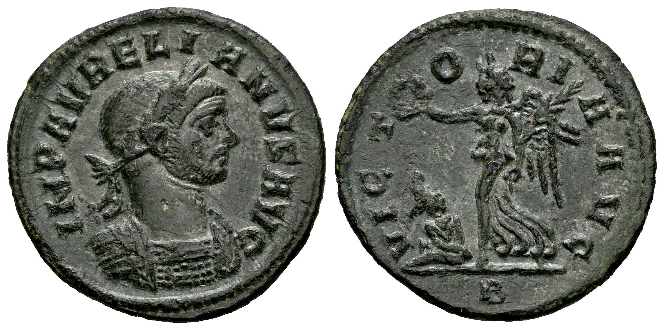 Aureliano. Denario. 270-275 d.C. Roma. (Ric-1853). Anv.: IMP AVRELIANVS AVG. Busto laureado y con coraza a derecha. Rev.: VICTORIA AVG. Victoria avanzando a izquierda, portando corona y palma, cautivo atado sentado a la izquierda mitando a derecha; B en exergo. Ae. 2,21 g. MBC+. Est...75,00.