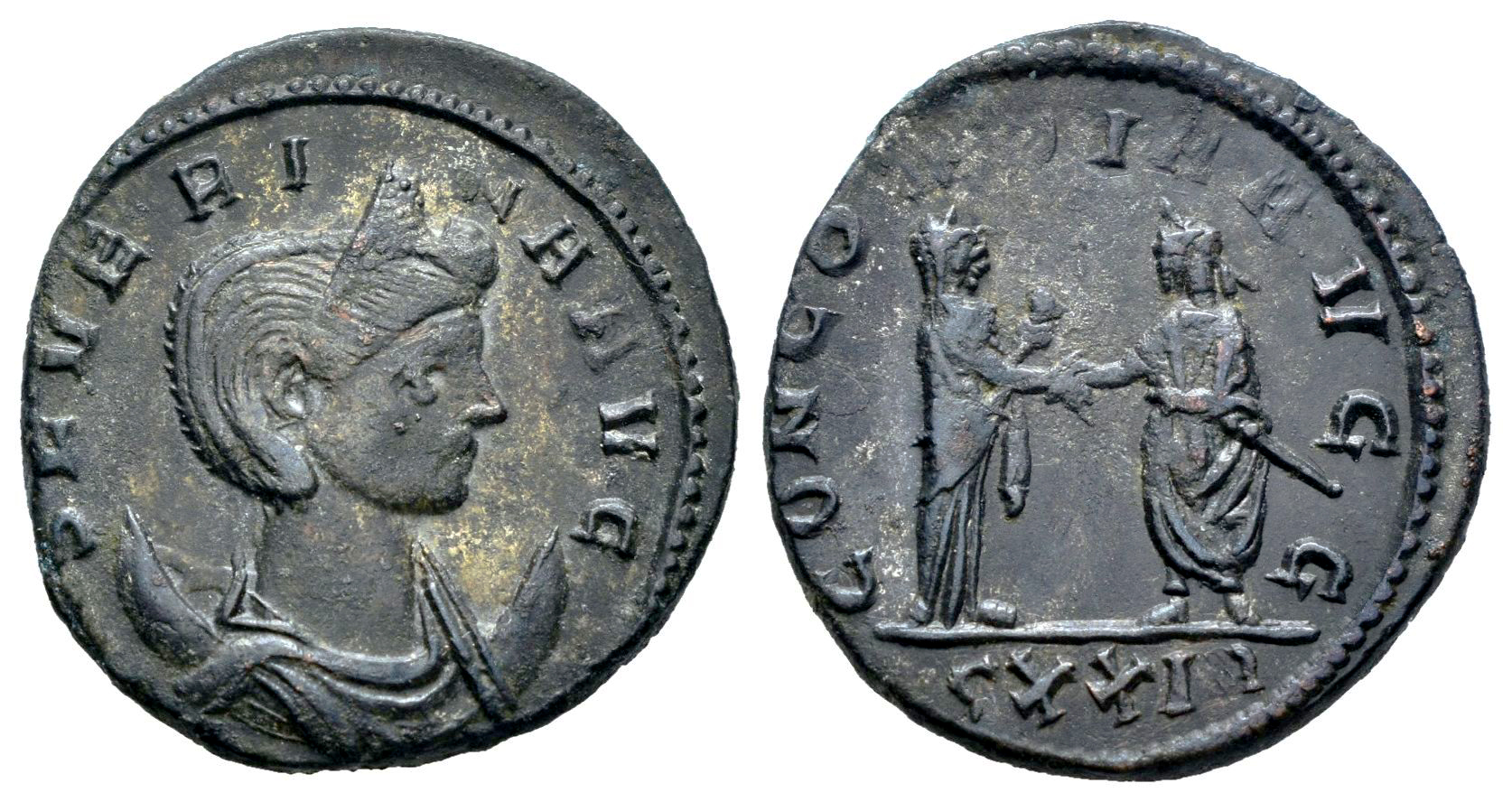 Severina. Antoniniano. 274 d.C. Roma. (Ric-V 1 3). (MER/RIC-1792). Anv.: SEVERINA AVG. Busto con diadema y drapeado a la derecha, situado sobre creciente. Rev.: CONCORDIA AVGG. Emperador en pie a la derecha, estrechando la mano de la Emperatriz en pie a la izquierda; ςXXIR en exergo. Ve. 3,96 g. MBC+. Est...60,00.