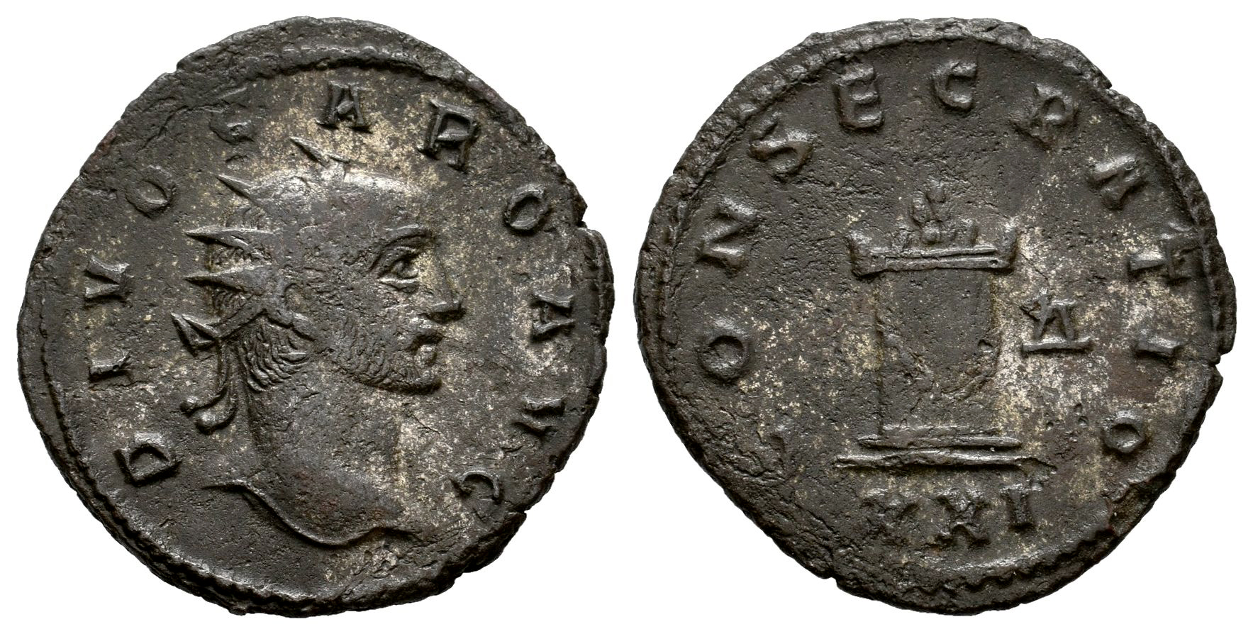 Divo Caro. Antoniniano. Mayo-Junio 284 d.C. Antioquía. Acuñado bajo Carino. (Ric-127). Anv.: DIVO CARO AVG. Cabeza radiada a la derecha. Rev.: CONSECRATIO. Altar adornado con guirnaldas; Δ en el campo derecho, XXI en exergo. Ae. 3,30 g. Escasa . MBC+. Est...90,00.