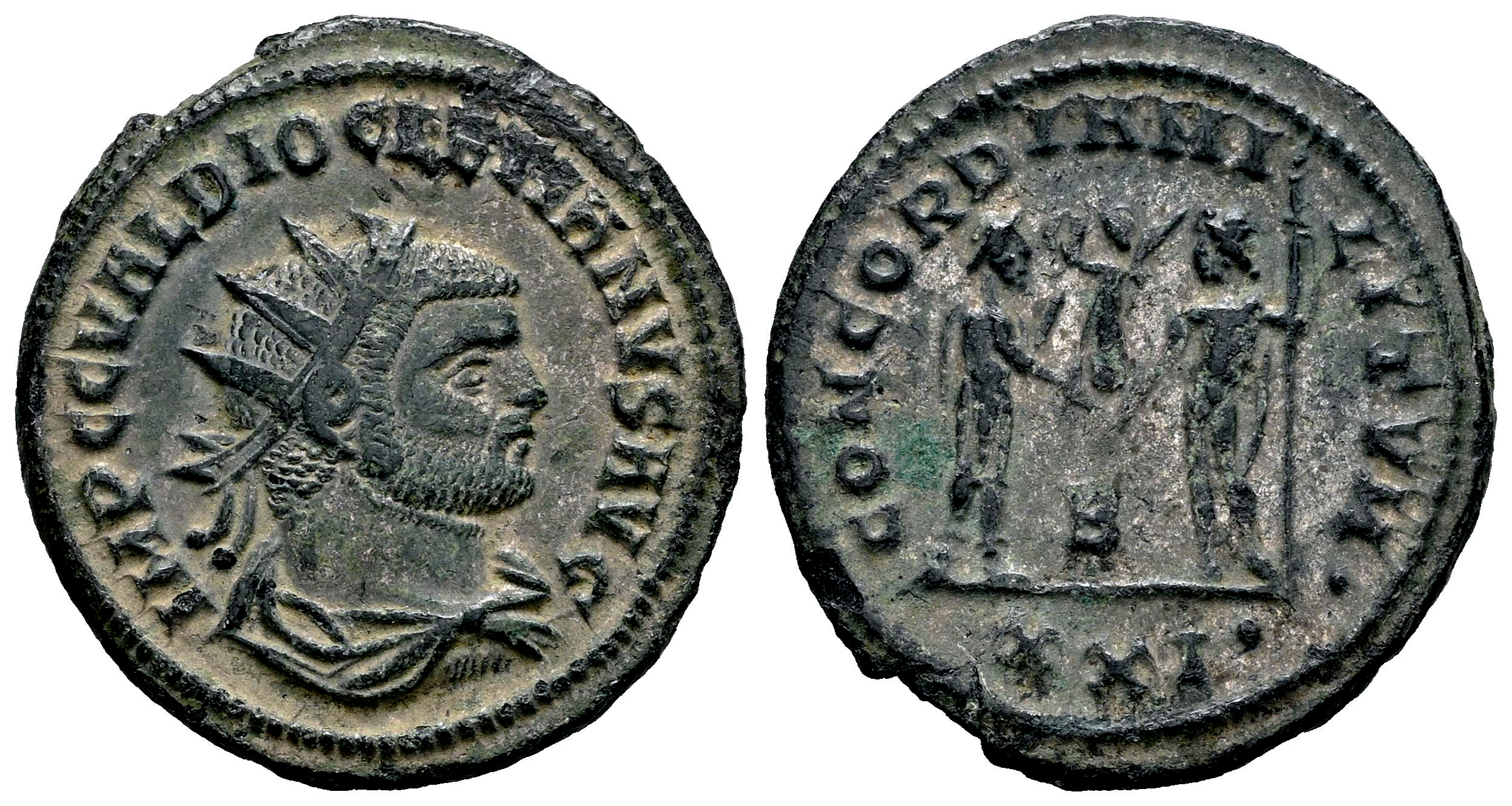 Diocleciano. Antoniniano. 293-295 d.C. Cyzicus. (Ric-306 (Antioch)). (Cohen-33). Anv.: IMP C C VAL DIOCLETIANVS AVG. Busto radiado, drapeado y con coraza, a la derecha. Rev.: CONCORDIA MILITVM. Diocleciano, a la izquierda, sosteniendo parazonium en su mano izquierda y recibiendo de Júpiter una Victoria sobre globo; a la derecha, sosteniendo un cetro largo en su mano izquierda, B entre ambos; XXI• en exergo. Ve. 3,91 g. Restos de plateado original. EBC-/MBC. Est...50,00.