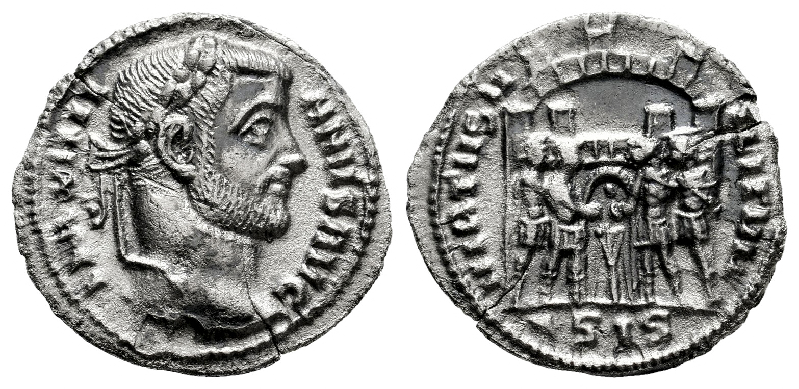 Maximiano. Argenteo. 300 d.C. Siscia. (Ric-VI 70). (Rsc-631a). Anv.: MAXIMIANVS AVG. Cabeza laureada a la derecha. Rev.: VIRTVS MILITVM. Puerta de campamento con cuatro almenas, puerta con puertas abiertas; *SIS en exergo. Ag. 2,75 g. Leves grietas. Alguna macha pero buen acuñación. EBC-. Est...500,00.