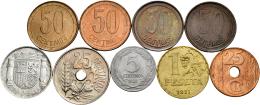 Lote de 9 monedas de la II República; 5 céntimos 1937, 25 céntimos 1934, 25 céntimos 1938, 50 céntimos 1937 orla cuadraditos, 50 céntimos 1937*3-4, 50 céntimos 1937*3-6, 50 céntimos 1937*3-6 orla cuadraditos, 1 peseta 1933*3-4 y 1 peseta 1937. Es imprescindible un riguroso examen. SOLO ENVÍO A ESPAÑA PENÍNSULA. NO SE ADMITE DEVOLUCIÓN. Est...100,00.