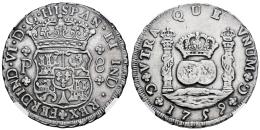 Fernando VI (1746-1759). 8 reales. 1759. México. MM. (Cal-495). Ag. Ligera pátina y suaves restos de brillo original. Encapsulada por NGC como AU 53. Est...600,00.