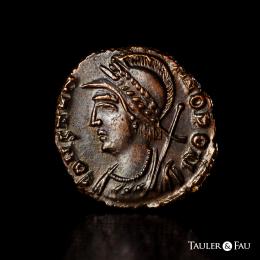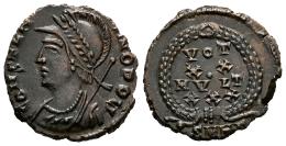 Constantino I. Series conmemorativas. Follis. 347-348 d.C. Heraclea. (Ric-VIII 50). (LRBC-961). (Tesorillo-S. Conmemorativas 56, mismo ejemplar). Anv.: CONSTANTINOPOLI, Busto laureado y con casco de Constantinopolis a la izquierda, vistiendo manto ornamental y collar, portando un cetro sobre el hombro. Rev.: VOT XX MVLT XXX en cuatro líneas dentro de corona; SMHΓ en exergo. Ae. 1,86 g. Cospel irregular. Extremadamente rara. Solamente dos ejemplares en Acsearch. EBC. Est...120,00.