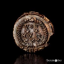 Constantino II. Follis. 321 d.C. Roma. (Ric-VII 236). (Tesorillo-Constantino II 9, mismo ejemplar). Anv.: CONSTANTINVS IVN NOB C, Busto laureado, drapeado y con coraza a la derecha. Rev.: CAESARVM NOSTRORVM, alrededor VOT • V en corona de laurel; RS en exergo. Ve. 3,32 g. MBC+/EBC. Est...50,00.