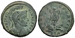 Constantino I. Series conmemorativas. Follis. 307/10-337 d.C. Heraclea. (Ric-VIII 29). (Tesorillo-S. Conmemorativas 40, mismo ejemplar). Anv.: CONSTANTINOPOLI. Busto de Constantinopla con casco y manto a la izquierda, portando un cetro. Rev.: GLORIA EXERCITVS.Dos soldados en pie uno frente al otro, cada uno sosteniendo una lanza y apoyando la mano sobre un escudo colocado en el suelo; entre ellos, un estandarte; SMHΓ en exergo. Ae. 2,16 g. Escasa. MBC/MBC+. Est...50,00.