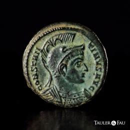 Constantino I. Follis. 332-333 d.C. Treveri. (Ric-VII 538). (Tesorillo-Constantino I 46, mismo ejemplar). Anv.: CONSTANTINVS MAX AVG, Busto laureado, drapeado y con coraza a la derecha. Rev.: GLORIA EXERCITVS, Dos soldados de pie uno frente al otro, cada uno sosteniendo una lanza y un escudo, con dos estandartes entre ellos; TR•S en exergo. Ae. 2,00 g. Ex Soler & Llach (Mayo 2009), lote 3022. MBC/MBC+. Est...30,00.