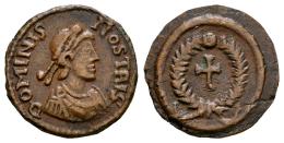 Bonifacio. Comes Africae. Nummus. 425-430 d.C. Cartago. (Ric-X 3814). (Tesorillo-Bonifacio 1, mismo ejemplar). Anv.: DOMINIS NOS TRIS. Busto a la derecha con diadema de perlas, drapeado y coraza. Rev.: Corona, cruz sobre globo en el interior. . 0,75 g. Alain Gennari presenta este mismo ejemplar en la portada de un artículo: Le serie “domino nostro” e “inbictissimo”: un aggiornamento, in Monete Antiche anno XX n. 116, marzo/aprile 2021.