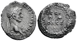 Vespasiano. Denario. 69 d.C. Roma. (Ric-119). (Bmcre-252). (Tesorillo-Vespasiano 12, mismo ejemplar). Anv.: IMP CAESAR VESPASIANVS AVG. Cabeza laureada a la derecha. Rev.: TR POT X COS VIIII. Figura radiada sosteniendo un cetro en la mano derecha sobre una columna rostral. . 3,41 g. Ex Ancient Delights, actual Mayor 25. Convención de Madrid (Diciembre 2005). MBC. Est...120,00.