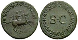 Nerón y Druso. Dupondio. 37-38 d.C. Roma. (Ric-I 34). (Bmcre-44). (Tesorillo-Nerón/Druso 1, mismo ejemplar). Anv.: NERO ET DRVSVS CAESARES. Nerón y Druso a caballo a la derecha. Rev.: C CAESAR AVG GERMANICVS PON M TR POT alrededor de gran S•C. . 16,97 g. Buen ejemplar con una bonita pátina verde. Ex Ancient Delights, actualmente Mayor 25. (Julio 2005). MBC+/EBC-. Est...400,00.