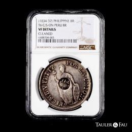 Isabel II (1833-1868). Resello tipo VI, "Y.II". coronada dentro de un círculo incuso. Aplicado sobre el anverso de una moneda de 8 reales de Perú 1836-MT acuñada en Lima. Emitido por decreto del 20 de diciembre de 1834 y suprimida el 31 de marzo de 1837 (por decreto del 1 de febrero de 1836). Resello bien marcado. Pátina. Encapsulada por NGC como VF Details, Limpiada. (Cal-668). Ag. Est...400,00.