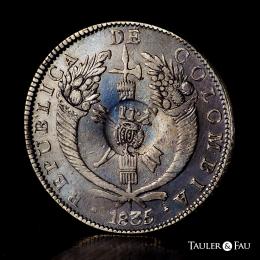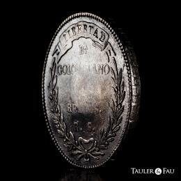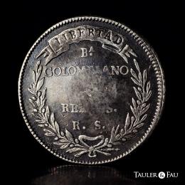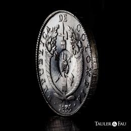 Isabel II (1833-1868). Resello tipo VI, "Y.II". coronada dentro de un círculo incuso para circular por Filipinas. Aplicado sobre el anverso de una moneda de 8 reales de la República de Colombia 1835-RS acuñada en Bogotá. Emitido por decreto del 20 de diciembre de 1834 y suprimida el 31 de marzo de 1837 (por decreto del 1 de febrero de 1836). Resello bien marcado. Pátina. Rara. (Cal-668). (Km-109). Ag. 26,82 g. MBC+. Est...2500,00.