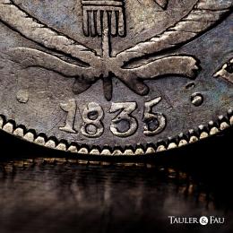 Isabel II (1833-1868). Resello tipo VI, "Y.II". coronada dentro de un círculo incuso. Aplicado sobre el anverso de una moneda de 8 reales de Perú 1835-MM acuñada en Lima. Emitido por decreto del 20 de diciembre de 1834 y suprimida el 31 de marzo de 1837 (por decreto del 1 de febrero de 1836). Resello bien marcado. Pátina. Estuvo en aro. (Cal-668). Ag. 24,45 g. MBC. Est...180,00.