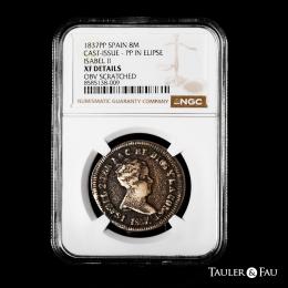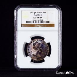 Isabel II (1833-1868). 8 maravedís. 1837. Jubia. (Cal-104). Ae. Bonito ejemplar. Escasa así. Encapsulada por NGC como AU 58 BN. Ex Tauler&Fau (23/10/2023), lote 3105. Est...350,00.