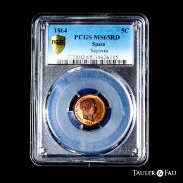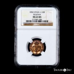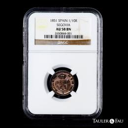 Isabel II (1833-1868). 10 céntimos de real. 1854. Segovia. (Cal-170). . 3,91 g. Brillo original. Precioso ejemplar. Parece una prueba. Rara, más en esta conservación. Encapsulada por NGC como MS 63 BN. Solamente 2 ejemplares mejor conservados según el censo de NGC. FDC. Est...1000,00.