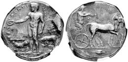 Sicilia. Siracusa. Tetradracma. 317-310 a.C. Agathokles. (Ierardi-19, O3/R11). (Ward 316, mismos cuños). (Jameson-861, mismo cuño de anverso). (Sng Ans-633/4). (Dewing-943, mismo cuño de reverso). (McClean-2818, mismo cuño de anverso). Anv.: Cabeza de Aretusa a izquierda, con corona de espigas, collar de perlas y pendiente triple; NI bajo el corte del cuello; tres delfines alrededor. Rev.: Auriga conduciendo una cuadriga al galope hacia la izquierda, portando el kentron y las riendas; trískeles encima; ΣYPAKOΣIΩN en exergo, monograma debajo. . 17,12 g.