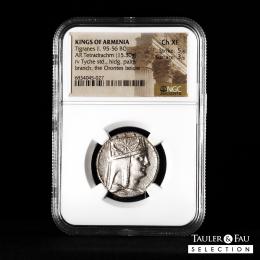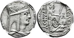 Reyes de Armenia. Tigranes II "El grande". Tetradracma. 83-70 a.C. Tigranokerta. (Kovacs-74.1). (ACV-30). Anv.: Busto con diadema y drapeado de Tigranes IIa la derecha, con tiara enjoyada con una estrella entre águilas que miran hacia adentro; borde de cuentas y aretes. Rev.: BAΣIΛEΩ/Σ - TIΓPANOY, Tyche sedente a la derecha sobre una roca, con una palma en la mano derecha extendida, el dios del río Orontes nadando justo delante; monograma AP en el campo derecho, monograma HΔ en la base de la roca, orla de laurel. . 15,30 g.
