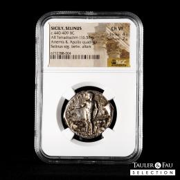 Sicilia. Selinos. Tetradracma. 415-409 a.C. (Hgc-2, 1221). (Sng Ans-699). (Schwabacher-30). Anv.: Apolo y Artemisa en pie a la derecha, en una cuadriga que avanza lentamente hacia la derecha; Artemisa sujetando las riendas y Apolo tensa su arco; abajo, espiga. Rev.: ΣΕΛΙΝΟΝΤΙ(ΟΝ). El dios del río Selinos en pie de frente, mirando a la izquierda, sosteniendo una rama de laurel en la mano izquierda y phiale en la derecha; a la izquierda, un altar con guirnaldas; delante del altar, un gallo de pie a la izquierda; a la derecha, una hoja de selinon sobre un toro en pie a la izquierda sobre una peana. . 16,53 g. Encapsulada por NGC como Ch VF, Strike 4/5, Surface 2/5. NGC-VF. Est...2000,00.