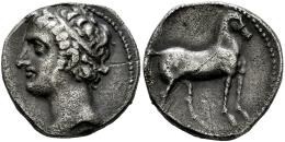 Acuñaciones Hispano-Cartaginesas. Siclo - Shekel. 227-221 a.C. Ceca incierta. (Abh-490). (Acip-557). (MIB-4182, mismo ejemplar). Anv.: Cabeza de Eshmoun-Apolo a izquierda. Rev.: Caballo parado a derecha. . 7,20 g.