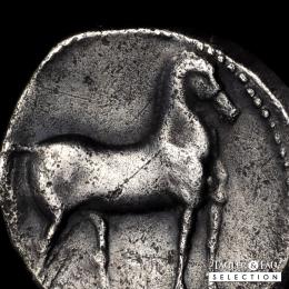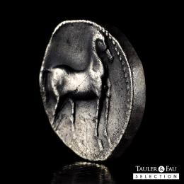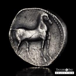 Entre ellos destacaron los maestros Kimon y Euainetos, cuyos grandes decadracmas de plata capturaron el espíritu de la revolución artística e intelectual que recorría el mundo griego. El decadracma de Euainetos se convirtió en un arquetipo ampliamente imitado en la numismática griega, y su retrato de Aretusa sigue siendo hoy un paradigma de la serena belleza clásica. Est...20000,00.
