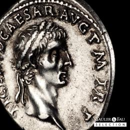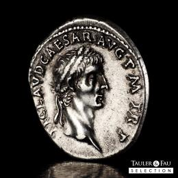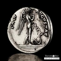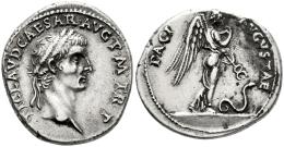 Claudio I. Denario. 41-42 d.C. Roma. (Ric-10). (Rsc-51). (Bmc-22). Anv.: TI CLAVD CAESAR AVG P M TR P. Busto laureado a derecha. Rev.: PACI AVGVSTAE, Paz-Némesis, alada y vestida, avanzando a derecha; sostiene con la mano derecha un pliegue del manto bajo el mentón y con la izquierda un caduceo alado apuntando hacia abajo, en dirección a una serpiente que se desliza a la derecha. . 3,76 g. Precioso retrato en alto relieve y de excelente estilo. Leves depósitos en reverso. Muy rara, más en esta extraordinaria conservación. EBC/EBC-. Est...4000,00.