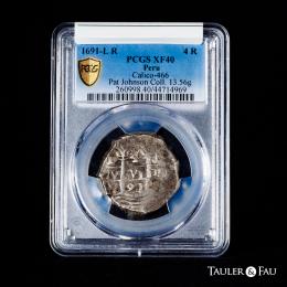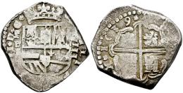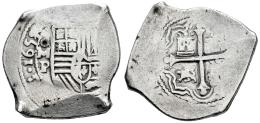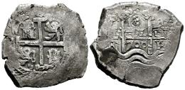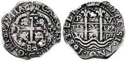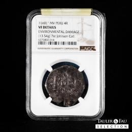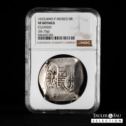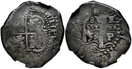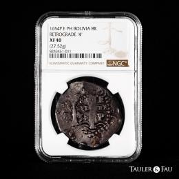Felipe IV (1621-1665). 8 reales. 1654. Potosí. E. (Cal-1508). . 27,52 g. Rara variante con el 4 de la fecha invertido. PH bajo la corona del reverso y valor en anverso. Doble fecha, una de ellas parcial y triple ensayador. Pátina. Encapsulada por NGC como XF 40 (Top Pop), el mejor ejemplar conservado en el censo de NGC. Est...900,00.