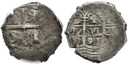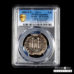 Carlos II (1665-1700). 2 reales. 1683. Potosí. V. (Cal-412). . 6,85 g. Triple fecha y triple ensayador. Acuñación muy redonda con las leyendas completas. Perforación. Muy rara en esta conservación. Encapsulada por PCGS como Holed - XF Details. Ex colección S.P. Rutherford. Est...1000,00.