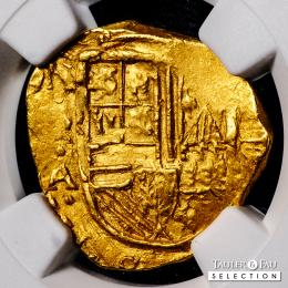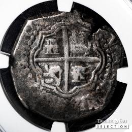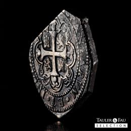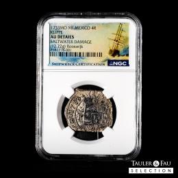 Una pieza que puede presumir de una conexión auténtica con la era de la piratería y los galeones del tesoro. Encapsulada por NGC como PCGS Genuine, Saltwater damage - AU Detail.