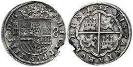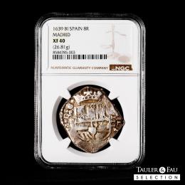Felipe IV (1621-1665). 8 reales. 1639. Madrid. BI. (Cal-1261). (Jarabo-Sanahuja-C44). . 26,81 g. Muy completa con todos los datos visibles. Ceca MD en vertical y ensayadores a la izquierda, valor a la derecha, y fecha de cuatro dígitos en reverso. Tres lises en el antiguo de Borgoña. Muy rara. Encapsulada por NGC como XF 40. Solamente 1 ejemplar mejor conservado según el censo de NGC. Est...1500,00.