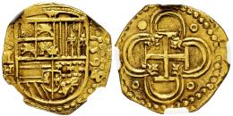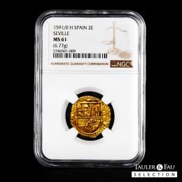 Felipe II (1556-1598). 2 escudos. 1591/0. Sevilla. H. (Cal-839). (Tauler-43). (Fried-169). . 6,77 g. Sobrefecha. Acuñación bien marcada con todos sus datos visibles. Muy bonito color. Rara, todavía más en esta conservación. Encapsulada por NGC como MS 61. Solamente 2 ejemplares mejor conservados según el censo de NGC. Est...3000,00.
