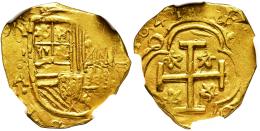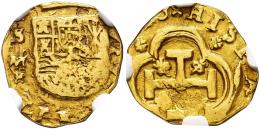 Felipe IV (1621-1665). 2 escudos. 1641. Santa Fe de Nuevo Reino. A. (Cal-1798). (Tauler-147). (Restrepo-M50-17). . 6,74 g. N/(R)/A a la izquierda, valor II tumbado a la derecha. Fecha completa de 4 dígitos en revrso. Acuñación muy nítida con un precioso color amarillo y sin marcar de desgaste. Muy buen ejemplar para este tipo que rara vez se encuentra en estas condiciones. Encapsulada por NGC como MS 62 (Top Pop), el mejor ejemplar conservado en el censo de NGC. Est...5000,00.