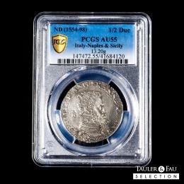 Felipe II (1556-1598). 1/2 ducado. 1575. Nápoles. GR/VP. (Tauler-684). (Vti-360). (Mir-174/7). . 14,91 g. GR detrás y VP bajo el busto. Suave tono en anverso. Bonita acuñación, muy buen ejemplar para el tipo. Rara en esta conservación. Encapsulada por PCGS como AU 55 (Top Pop), el mejor ejemplar conservado en el censo de PCGS. Est...600,00.