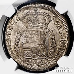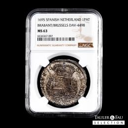Carlos II (1665-1700). 1 patagón. 1695. Bruselas. (Tauler-3391). (Vti-458). (Vanhoudt-715.AN). . Suave pátina de monetario con brillo original subyacente. Extraordinario atractivo visual. Muy rara en esta conservación. Encapsulada por NGC como MS 63 (Top Pop), el mejor ejemplar conservado en el censo de NGC. Est...1000,00.