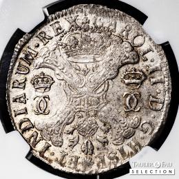 Carlos II (1665-1700). 1 felipe. 1676. Milán. (Tauler-3101). (Vti-19). (Mir-387/1). . 27,84 g. Ligero tono de monetario con brillo original subyacente. Fuerte acuñación con todos sus detalles perfectamente visibles y un extraordinario atractivo visual. Leve defecto en el canto. Muy rara en esta conservación. Encapsulada por NGC como MS 63 (Top Pop), el mejor ejemplar conservado en el censo de NGC. Est...1500,00.