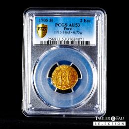 Monedas de naufragio. Felipe V (1700-1746). 2 escudos. 1705. Lima. H. (Cal-1822). (Tauler-244). . 6,75 g. Acuñación uniforme, con todos sus datos perfectamente visibles y las leyendas completas. Bonito tono anaranjado que realza su atractivo visual. Muy rara, especialmente en esta conservación.