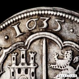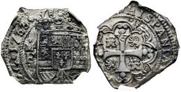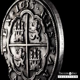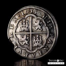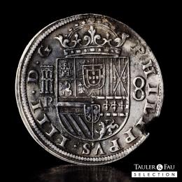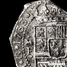 Monedas de naufragio. Felipe IV (1621-1665). 8 reales. 1635. Segovia. R. (Cal-1606). . 27,14 g. Maravilloso ejemplar con peso completo y prácticamente sin afectación por agua salada, con todos los detalles completos y bien marcados, además de una agradable y ligera pátina. Defecto de acuñación en el canto.
