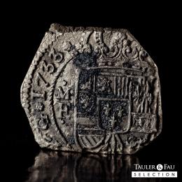 Monedas de naufragio. Felipe V (1700-1746). 8 reales. 1739. México. MF. (Cal-1453). . Preciosa pátina con un acentuado tono azulado. Sin apenas oxidaciones marinas y sin apenas marcas de desgaste. Muy buen ejemplar.