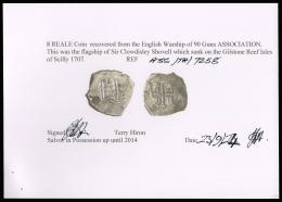 Monedas de naufragio. Carlos II (1665-1700). 8 reales. 1700. Potosí. F. (Cal-1746). . 26,77 g. Procedente del naufragio del "H.M.S. Association", hundido en 1707 frente a las Islas Scilly, al suroeste de Inglaterra. Incluye foto certificado ASS/TH/7258 emitido por el rescatador.