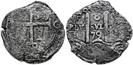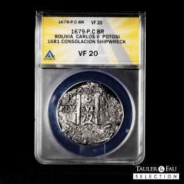 Monedas de naufragio. Carlos II (1665-1700). 8 reales. 1679. Potosí. C. (Cal-714). . Doble fecha, una de ellas parcial y doble ensayador. Oxidaciones marinas. Procedente del naufragio de "Nuestra Señora de la Consolación", hundido en 1681 frente a la isla de Santa Clara, Ecuador.