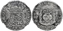 Monedas de naufragio. Felipe V (1700-1746). 8 reales. 1740. México. MF. (Cal-1456). . Procedente del naufragio del "Hollandia", hundido en 1743 frente a las islas Scilly, al suroeste de Inglaterra.